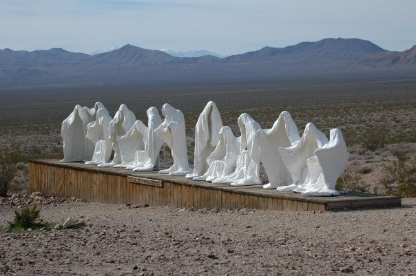 In 2000 after the death of Albert Szukalski, the Belgian artist who created the site’s first sculptures in 1984 near the abandoned railway station in Rhyolite. The sculpture, The Last Supper, consists of ghostly life-sized forms arranged as in the painting The Last Supper by Leonardo da Vinci. Szukalski molded his shapes by draping plaster-soaked burlap over live models until the plaster dried enough to stand on its own. In the same year, using the same techniques, Szukalski also created Ghost Rider, a plaster figure preparing to mount a bicycle.